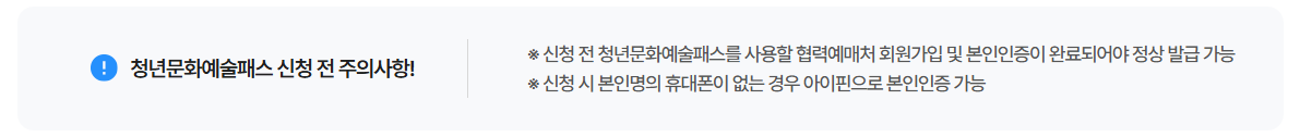 - 청년문화예술패스는 신청자 본인만 사용 가능하며, 동일회차 공연·전시는 1매만 예매 가능합니다.