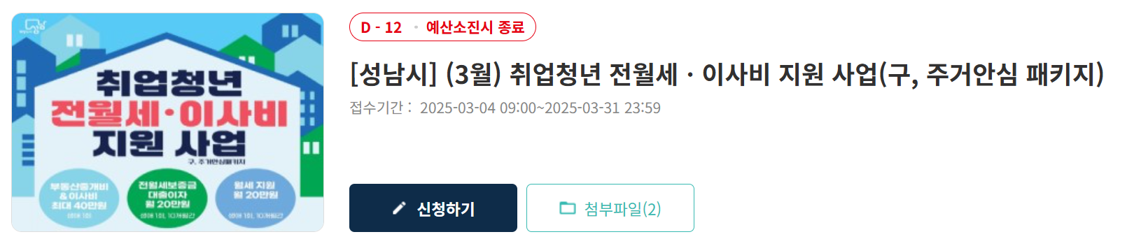 또한, 부동산 중개비와 이사비 지원은 2024년 7월 1일 이후 성남시로 전입하거나 성남 내에서 다른 지역으로 이사한 청년을 대상으로 합니다. 전세보증금 대출이자와 월세 지원은 신청일 기준 1개월 전에 성남시로 전입신고를 마친 경우에 해당됩니다.